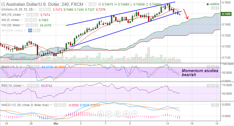 - AUD/USD was unable to extend gains beyond the 8-month highs at 0.7593 and had slipped lower to currently trade at 0.7492.
