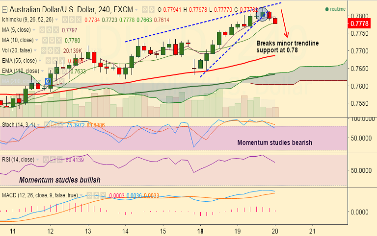 - 4H 10-SMA support at 0.7781 is holding on the downside, breaks below will accentuate downside.