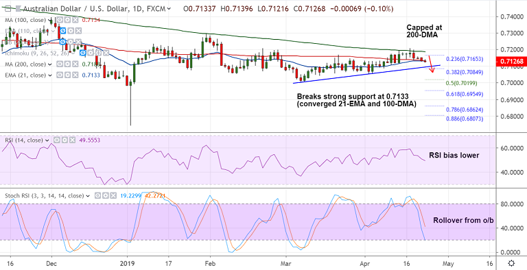 - Price action has broken strong support at 0.7133 (converged 21-EMA and 100-DMA). Eyes 50-DMA at 0.7112 ahead of 0.7095 (trendline support).
