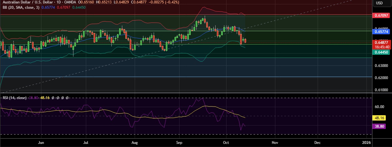 • Support is seen at 0.6470(50%fib) and break below could take the pair towards 0.6447 (Lower BB).
