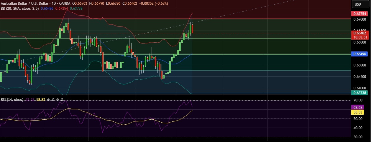 • Immediate resistance is located at 0.6701(23.6%fib), any close above will push the pair towards 0.6726(23.6%fib).