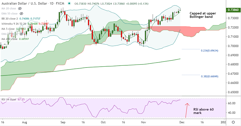 AUD/USD trades with a bullish bias, but upside is capped at upper Bollinger band at 0.7408. Over pressures may see some pullback.