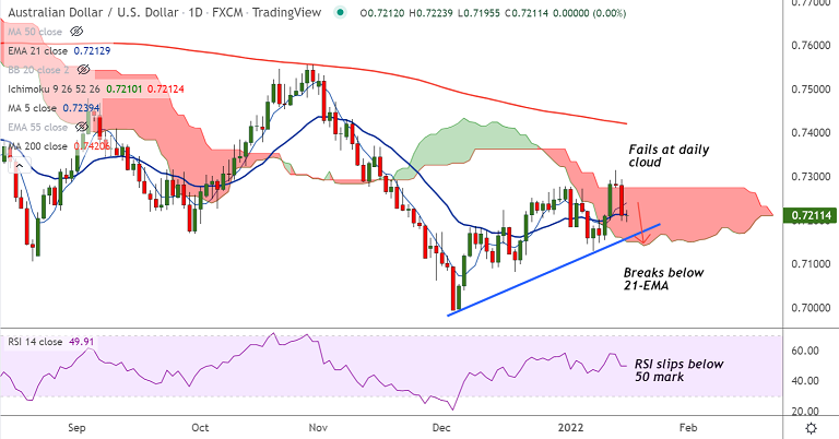 Summary: AUD/USD trades with a bearish bias. The par is on track to test trendline support at 0.7165.