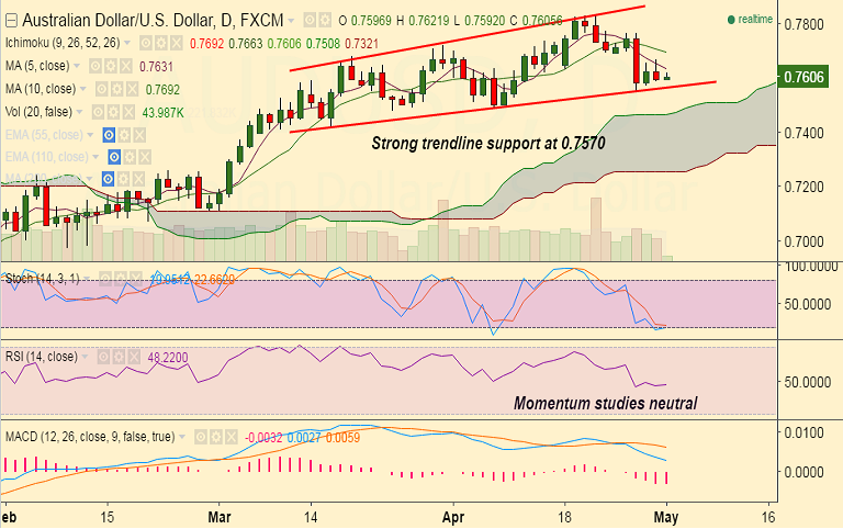 - On the daily charts, the pair finds strong support at 0.7570 (rising trendline). Breaks below will take the pair to test next support at 0.7548 and then 0.75.