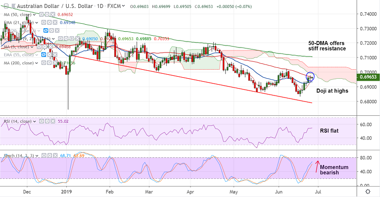The pair finds stiff resistance at 50-DMA at 0.6965. Upside fails to break above from the past 3 sessions.