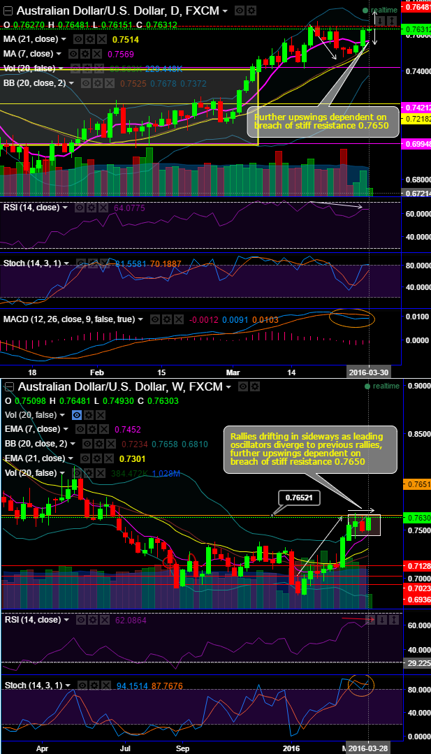AUD/USD hasn't been able to to break resistance at 0.7650 levels quite often in recent times (see weekly charts for inability to take the rallies above 0.7650 from last 2-3 weeks).
