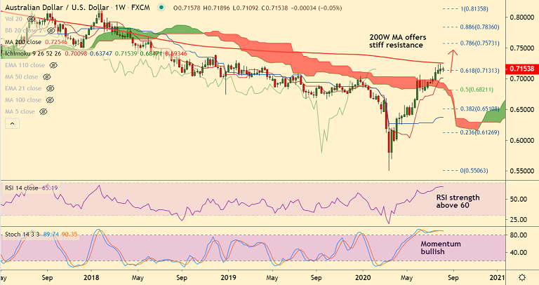 21-EMA is immediate support at 0.7121. Break below will see dip till 50-DMA at 0.7013.