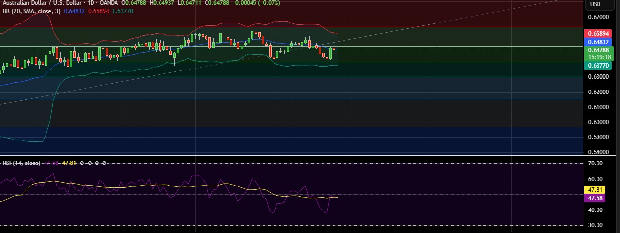 • Support is seen at 0.6400 (50%fib) and break below could take the pair towards 0.6384(Lower BB).