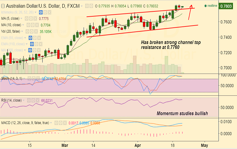 - Immediate support lies at 0.7775 (5-DMA), while resistance is located at 0.7826 (April 19th highs).