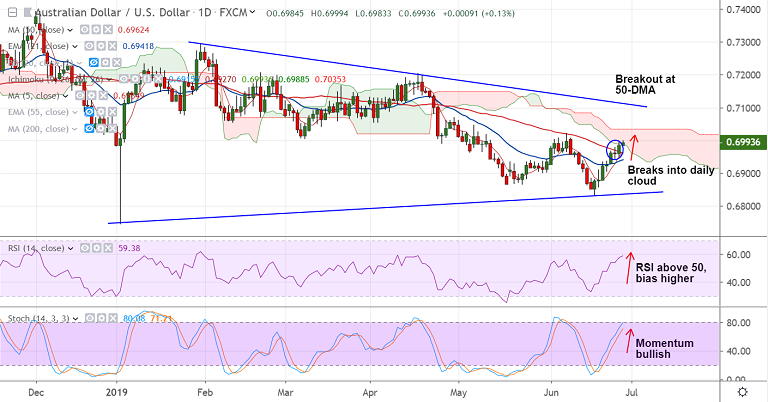 Next bull target lies at 110-EMA at 0.7033. Further upside could see test of 200-DMA at 0.7104.