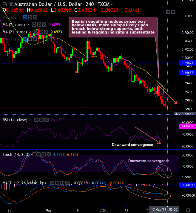 While bearish MACD and EMA crossovers substantiate the bearish sentiments indicating the prevailing downtrend to prolong further. Overall, we could foresee no traces of recovery as the Aussie goes vulnerable on fundamental grounds as well.
