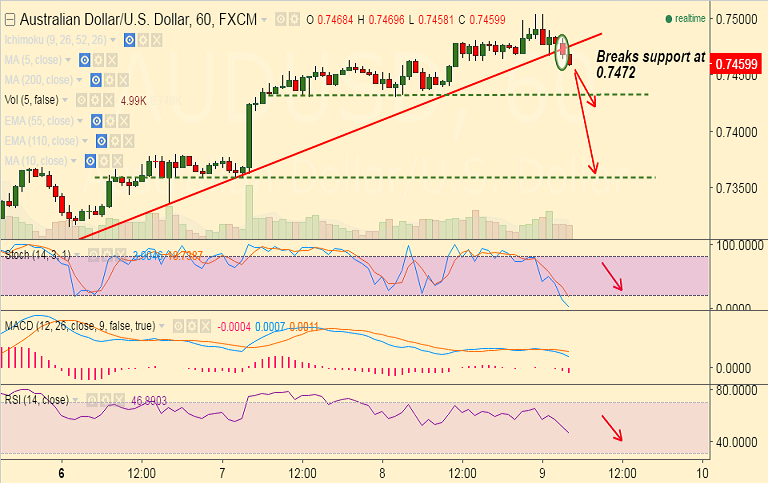 - Supports on the downside are seen at 0.7430 (trendline), 0.7422 (5-DMA) and 0.74.