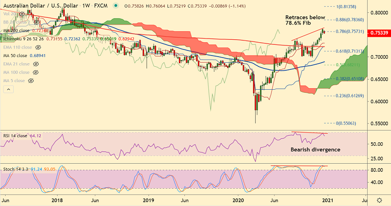 AUD/USD slumps around 1.25% on the day, eyes 0.75 mark on weakening investor sentiment.