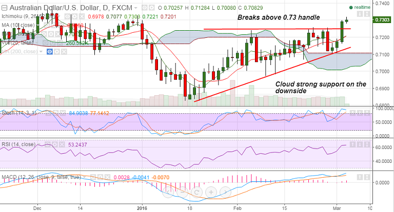 - Weak Chinese Caixin services PMI report failed to weaken the bulls, AUD/USD spike past 0.73 handle to hit new highs of 2016 at 0.7321.