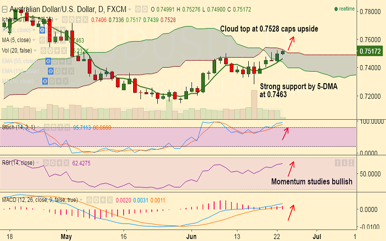 - Pair now finds immediate support at 0.7463 (5-DMA) and resistance at 0.7528 (cloud top).
