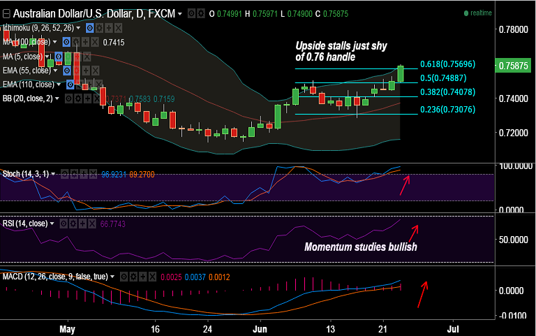 - AUD/USD spiked higher, upside stalls just shy of 0.76 handle.