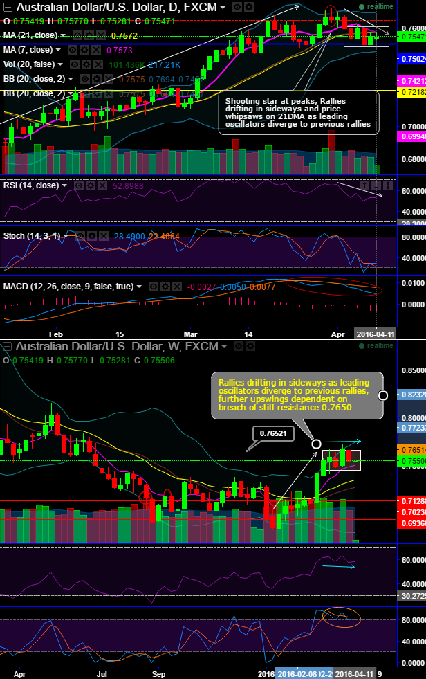 AUD/USD is struggling to break resistance at 0.7572 (21DMA), yesterday also tested the resistance at the same levels, as a result we think since it doesn't manage to break above decisively on a closing basis which would likely create more bearish potential in days to come.