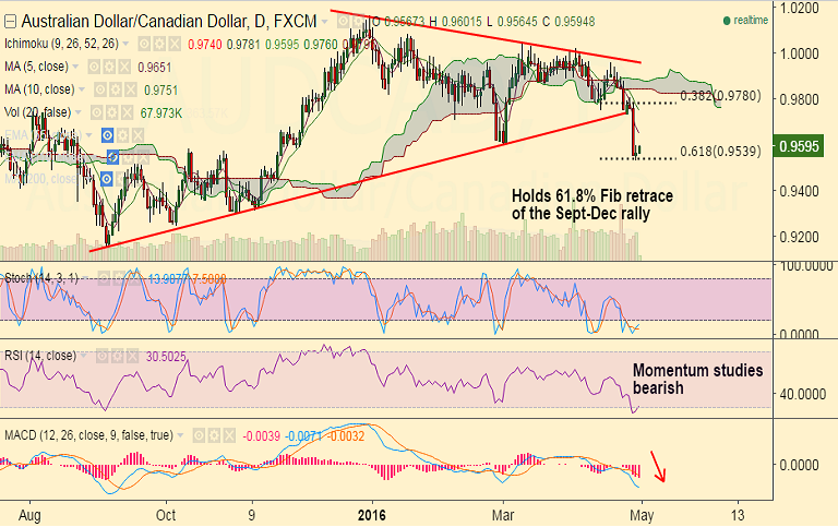 FxWirePro: AUDCAD consolidating Wednesday’s drop, holds above 61.8% Fib of Sept-Dec rally