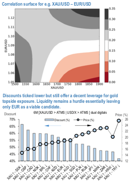 In the above exhibit, below chart analyzes USD de-correlation dual digitals of type XAUUSD up & USDCCY up. While the discounts ticked lower over last few weeks the combinations invoking high beta G10 still offer very solid savings. That said, the mid pricing should be taken with a grain of salt as XAU x- vol liquidity continues to limit the tradable pool. With that liquidity constrain in mind we are willing compromise and consider EUR even as the XAUUSD – EURUSD correlations dropped precipitously since the beginning of April. With EURUSD ATMS strike showing better correlation levels than OTMS strikes (refer above chart) consider the following as a leveraged expression for a more forceful than expected medium term upside surprise in gold: