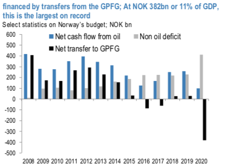 On the fiscal side, the revised Norwegian budget was larger than originally anticipated with a fiscal thrust of 5.1% of GDP, 0.5%pts larger than initial estimates making Norway’s fiscal response among the largest globally. The corollary of lower oil prices and the large fiscal response is that net oil revenues have plummeted by 60%, which necessitates that the bulk (80%) of the non-oil balance of be funded via the GPFG. This would be the largest use of the GPFG on record (refer 1st chart) and is relevant for the currency since it involves sales of FX to buy NOK. The estimated FX sales/ NOK purchases are in the ballpark of NOK 382bn or11% of 2020 GDP, which is 2.7x Norway’s current account surplus in 2019.