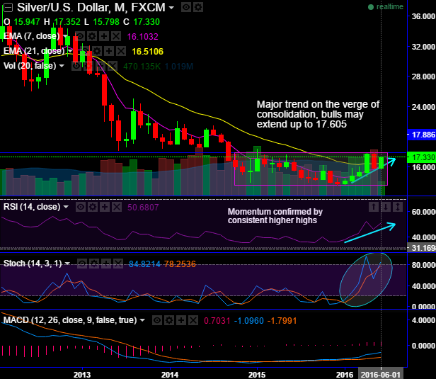 Technically, long-term investment perspectives, the major trend of Silver is still on the verge of consolidation pattern as the bulls may extend up to 17.605 (see the rectangular area on the monthly charts).