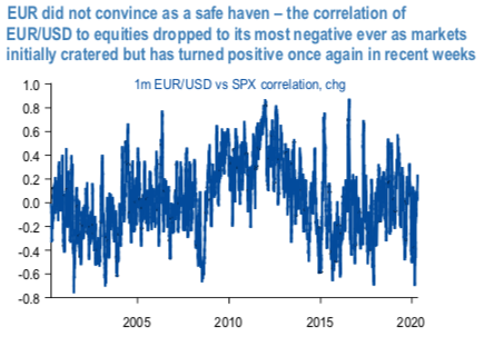 While from the onset of the COVID-19 crisis we have rejected the notion that EUR could function as an effective safe- haven for any extended period of time. The initial surge in EURUSD when equities first cracked may have been impressive – the negative co-movement between EUR and equities was the most extreme on record – but in our view this was caused by inherently temporary, one-time unwinding of a certain class of EUR-funded financial market carry trades. We maintained that once this initial round of deleveraging was exhausted EURUSD was prone to a reversal. This it has subsequently done and the correlation to equities has indeed turned positive once more (refer 1st chart). There are various reasons for this relapse in EURUSD.