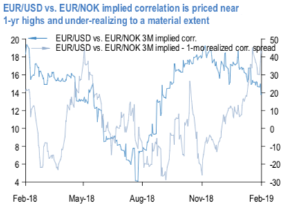 As a result, options markets typically factor in tepid sub-20% implied correlations between EURUSD and EUR/Scandi crosses, which still often proves excessive relative to realized corrs.