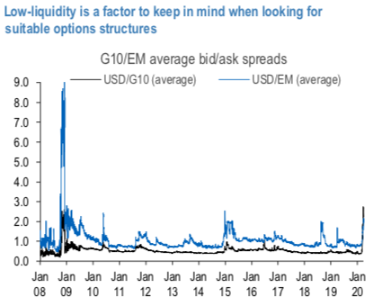 Current FX market dynamics are, in any case, consistent with a low liquidity mode, a factor which in itself could artificially trigger higher volatilities, as does the large rotation in speculative flows as observed over the past month. The peculiar nature of current FX vol mode is confirmed when observing how, for the first time on record, an average proxy of bid/ask spreads on a liquid set of G10 vols overshoots that for EM vols (refer above chart), a factor that is mostly attributed to NOK, AUD and GBP. When looking for current opportunities in the vol space, one needs to be aware of the limitations the current liquidity conditions are posing. Courtesy: JPM