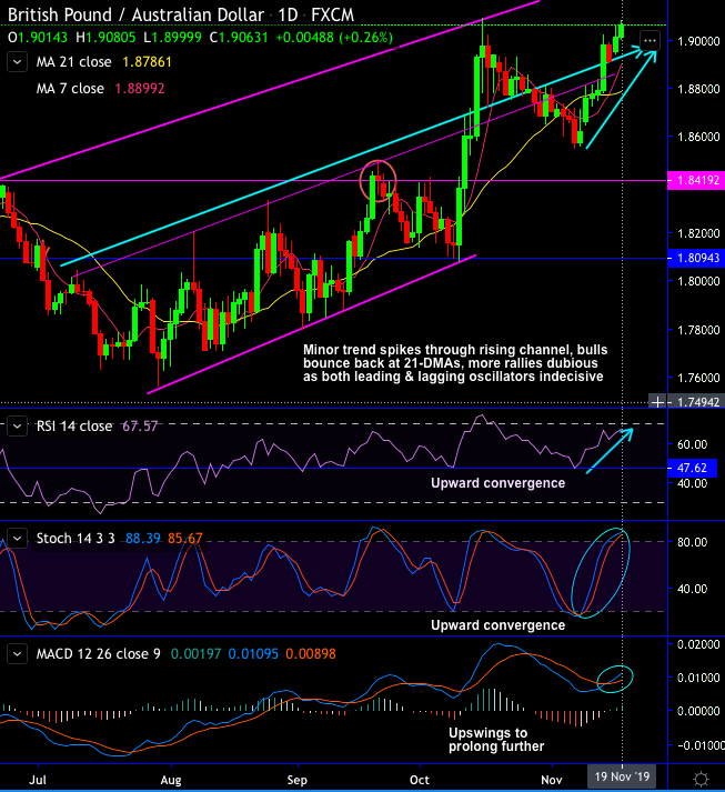 The interim bulls have resumed after bottoming out at 1.8546 levels and continued upswings above 7-DMAs with bullish crossover, bullish engulfing pattern is seen at 1.8979 level that has taken off the rallies above DMAs and EMAs (refer daily & weekly plotting).