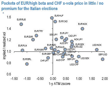Well, in gamma space, we find vol risk premia narrowly concentrated in EUR/low beta pairs (refer above chart). This leaves attractively priced pockets of direct exposure in EUR/high beta.