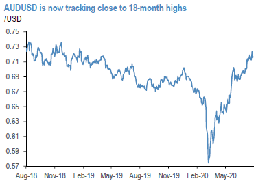 AUD has continued to rally over the past month and briefly broke through 0.72, the highest level since early 2019 (refer 1st chart). Drivers of the rally are unchanged from recent months, with a combination of leverage to risk markets/bearish USD expressions, and more idiosyncratically, strength in iron ore prices exerting upward pressure. The recent outperformance of the exchange rate, alongside upward revisions to the iron ore price outlook by J.P. Morgan commodity analysts deliver near term upside risks to our AUD forecasts. Still, resumption of COVID-19 cases and a stalling in the national economic recovery keep us cautious. We forecast a decline to 0.66 at Dec-20.