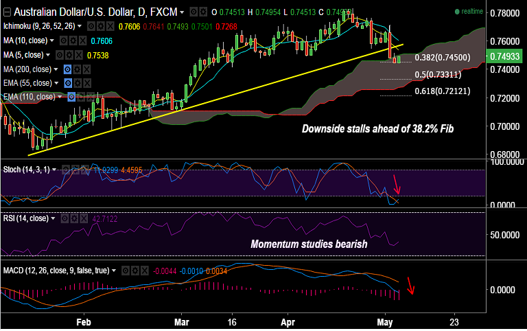 - The pair finds strong resistance at 0.75 (cloud top) and support on the downside is seen at 0.7450 (38.2% Fib).