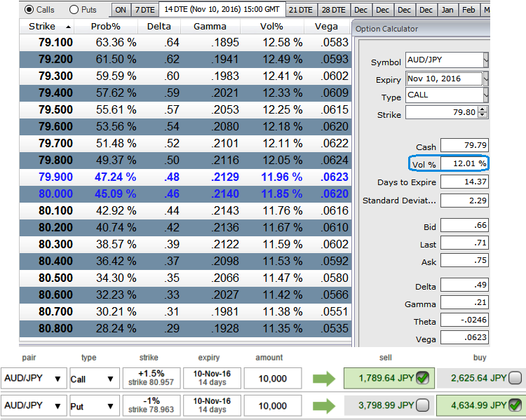 Thus, the strategy goes this way: while you're holding longs in spot FX of AUDJPY, go short in 2w (1.5%) OTM striking call and long in 2w (1%) OTM striking put. Since the short term bullish sentiments are mounting we kept upside bracket little on the higher side.