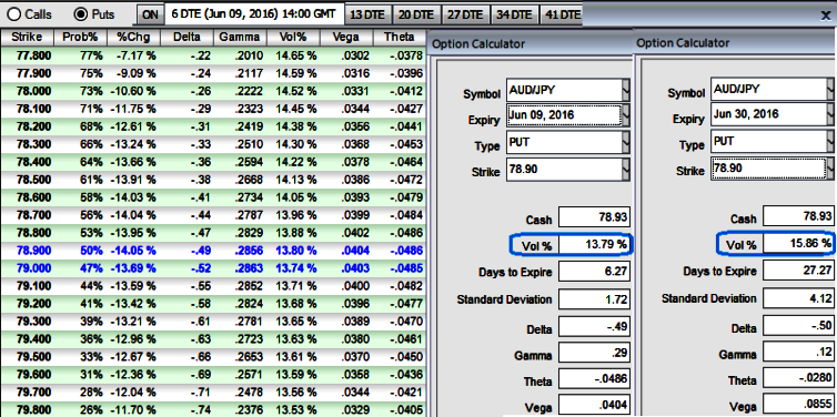 As we anticipate the underlying currency exchange rate of AUDJPY to make a big move on the downside, preferring to purchase 1M 2 lots of At-The-Money -0.51 delta puts and sell 1W one lot of (1%) In-The-Money put option.