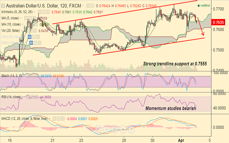 - Strong support seen at 0.76 levels, breaks below could see test of 0.7555 (trendline support). Resistance on the upside is seen at 0.7652 (5-DMA) and then session highs at 0.07678