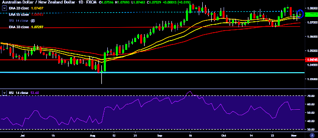 - AUD/NZD is currently trading around 1.0749 marks.