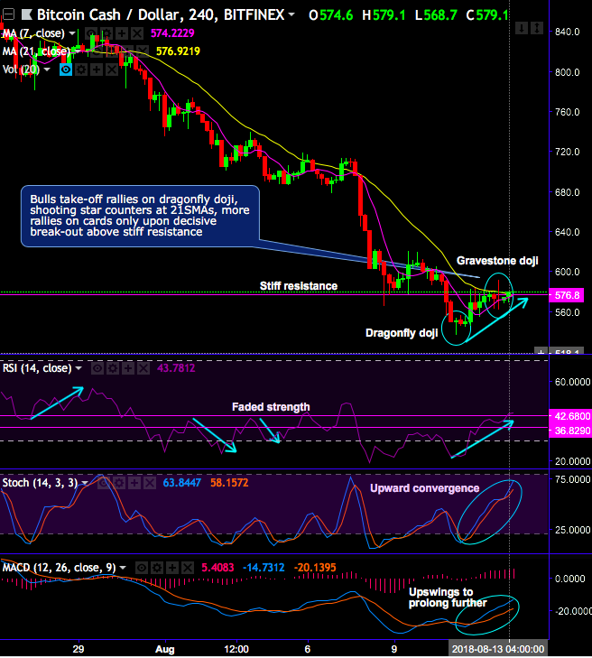 - Dragonfly doji pattern candle has occurred at $550.7 levels, ever since then, bulls began taking off rallies 21-SMAs, whereas, the gravestone doji pattern pops up at stiff resistance zone (at 571.6 levels to be precise) to counter the previous bullish sentiment (refer 4H chart).