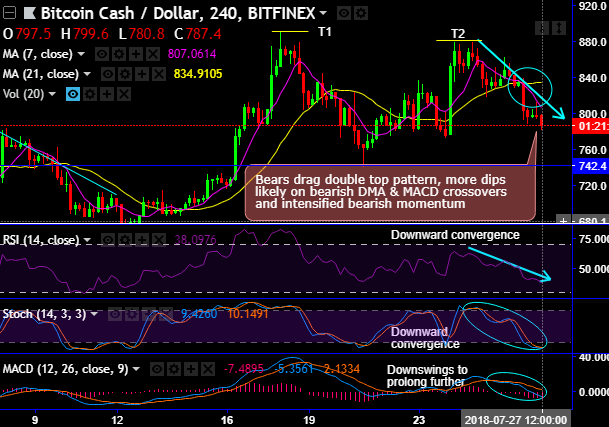 On a broader perspective, in tandem with the bearish phase of cryptocurrency industry, bitcoin cash (BCH) has also plunged considerably in the price and value in the recent past from the highs of $3,500 to the current $791 levels while articulating. The trend has been sliding through sloping channel which is again bearish in nature while shooting star pops up at channel resistance (at 803.7 levels, refer daily plotting). Both moment oscillators (RSI and stochastic curves) on this timeframe signal intensified bearish momentum.