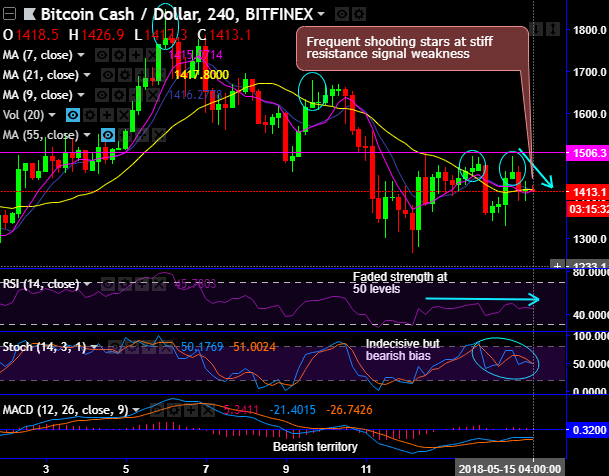 BCHUSD (Bitcoin coin cash) forms shooting stars quite frequently at 1466.9, 1478 and now at 1458 levels, both leading oscillators evidence faded strength and lagging indicators signal uptrend reversal (refer daily chart). Whereas on weekly plotting, long-legged doji is occurred at 1759.7 levels which is bearish in nature, both RSI and stochastic on this timeframe signal bearish momentum.