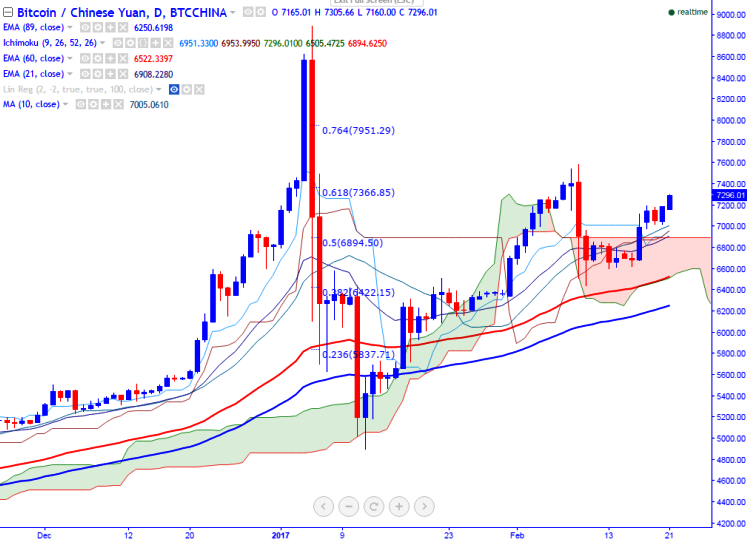 BTC/CNY is seen trading above on Tuesday. The pair has jumped till 7305after breaking minor resistance at 7200 high made on Feb 18th, 2017 high (BTCCHINA). It is currently trading around 7396 at the time of writing.