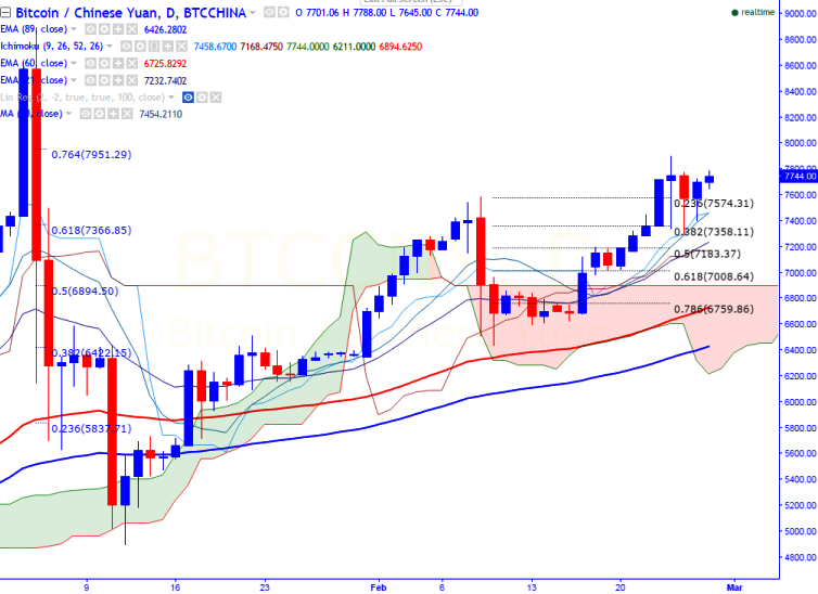BTC/CNY is seen trading slightly above on Monday. The pair has made a temporary top around 7902 on Feb 24th, 2017 and shown minor profit booking from that level (BTCCHINA). It is currently trading around 7712 at the time of writing.