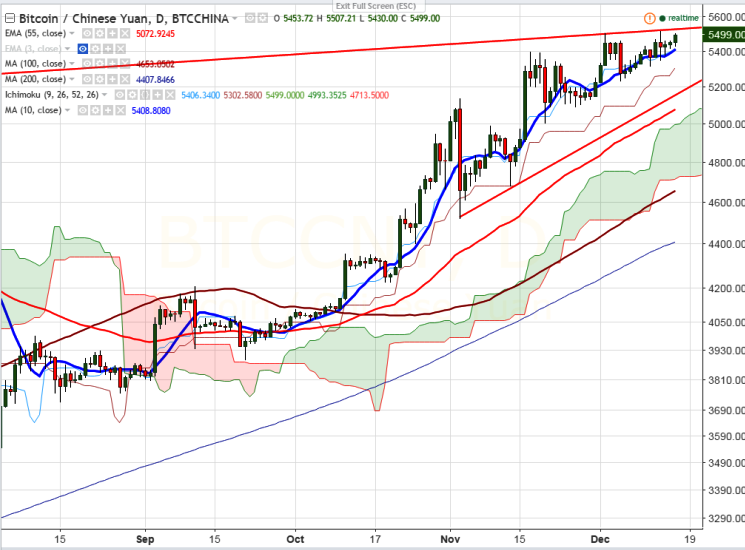 BTC/CNY is seen trading above on Friday. The pair has once again jumped slightly after declining till 5416 levels (BTCCCHINA). It is currently trading around 5496 at the time of writing.
