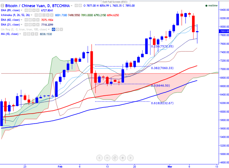BTC/CNY is seen plunging below on Wednesday. The pair has recovered slightly after declining till 7603 (BTCCHINA). It is currently trading around 7840.11 at the time of writing.