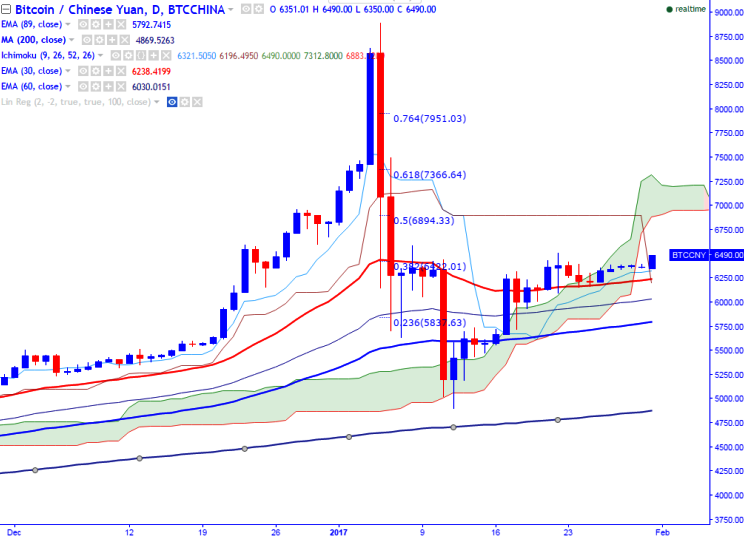 BTC/CNY is seen trading well above on Tuesday. The pair is showing a mild recovery today after a consolidation in a narrow range between 6390 and 6157 for the past five trading sessions (BTCCHINA). It is currently trading around 6500 at the time of writing.
