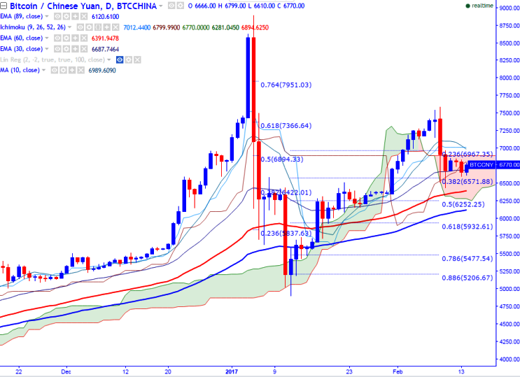 BTC/CNY is seen trading low on Tuesday. The pair has shown a mild recovery after declining till 6597 levels (BTCCHINA). BTCC/CNY faces minor resistance at 6876 and any minor bullishness can be seen only above that level. It is currently trading around 6690 at the time of writing.