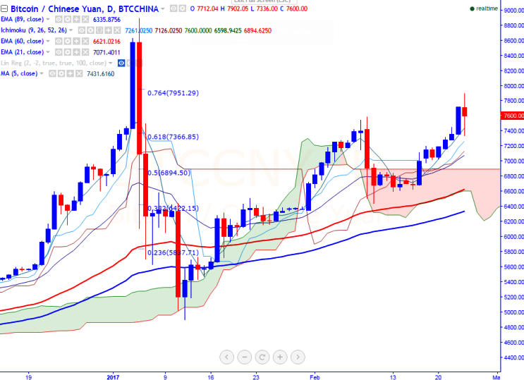 BTC/CNY is seen trading slightly below in red on Friday. The pair has broken the minor top of 7589 made on Feb 9th, 2017 and jumped till 7902 (BTCCHINA). It is currently trading around 7649 at the time of writing.