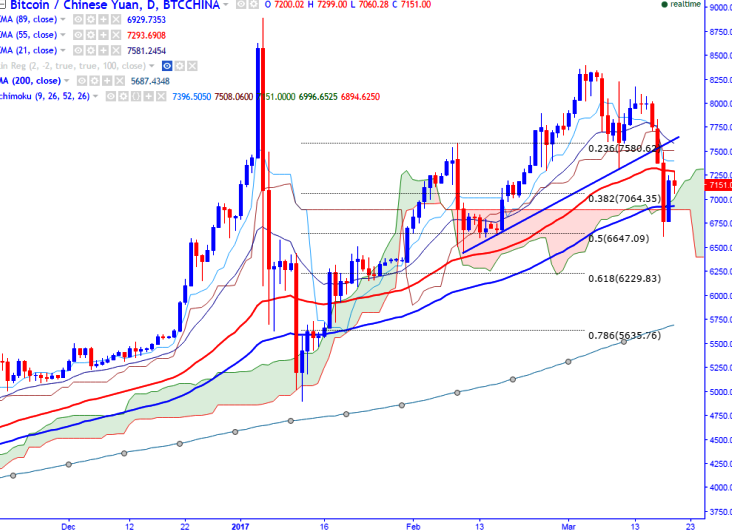BTC/CNY is seen trading slight below on Monday and the pair has slightly recovered after making a low of 6610 level (BTCCHINA). BTC/CNY is currently trading around 7151 at the time of writing.