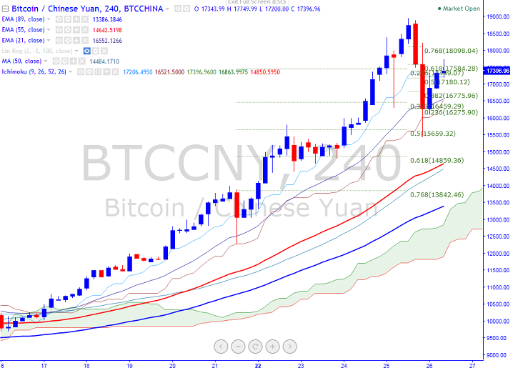 Long-term trend remains to be bullish. BTC/CNY faces minor support at 50% fibo and break below targets 14400/12267/11567 in the short term.