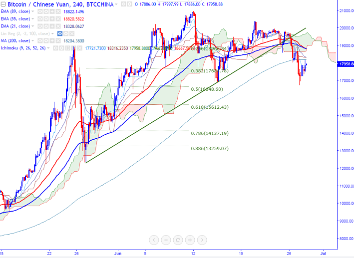 Long-term trend remains to be bullish. BTC/CNY faces strong support at 50% fibo at 16648 and a break below confirms further bearish continuation.