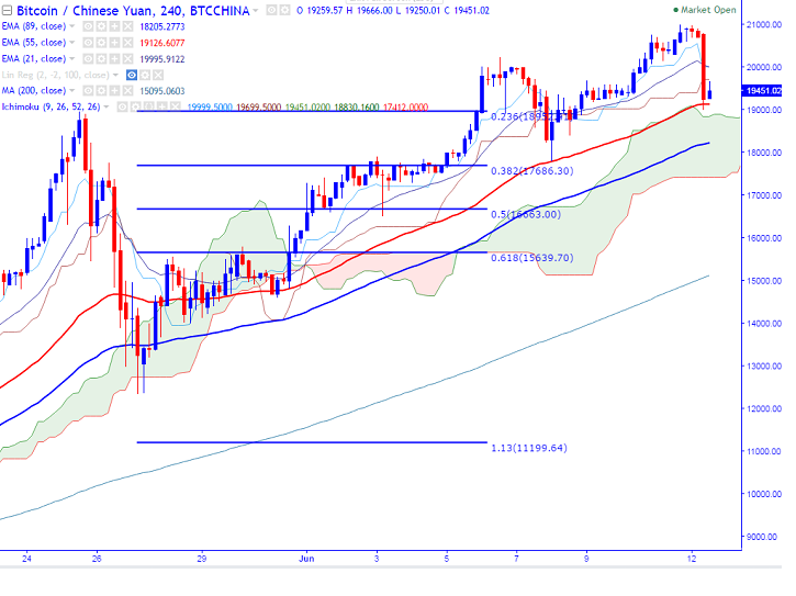 Minor resistance is around 19699 (4H Kijun-Sen) and any break above targets 20220 (Jun 6th high)/21000. Short term support is seen at 19000 (55- 4H EMA) and any break below will drag the pair till 18400/17795 (Jun 8th 2017 low).
